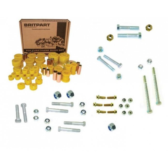 Ця абсолютно нова лінійка поліуретанових втулок Britpart виготовляється ексклюзивно для Britpart з використанням новітньої поліуретанової технології VulkollanT. Вони обробляються з точними допусками після відливання, щоб отримати найвищу доступну обробку. Ці втулки є тією ж сумішшю, яка забезпечує подібні характеристики їзди, як і стандартні гумові втулки, але вони пропонують покращену артикуляцію, гасіння вібрації та служать довше. У комплект входять амортизатор і втулки А-образної рами. Комплект містить: DC7010 x 1 253952 x 2 BH114167 x 1 BH116207 x 4 BH610321L x 2 BH612321 x 2 SX110301 x 6 NV114047 x 2 NY110047L x 6 NY120046 x 4 NY608042 x 2 NY610041L x 2 NY612042 x 2 NV116047 x 4 RYG501560 x 1